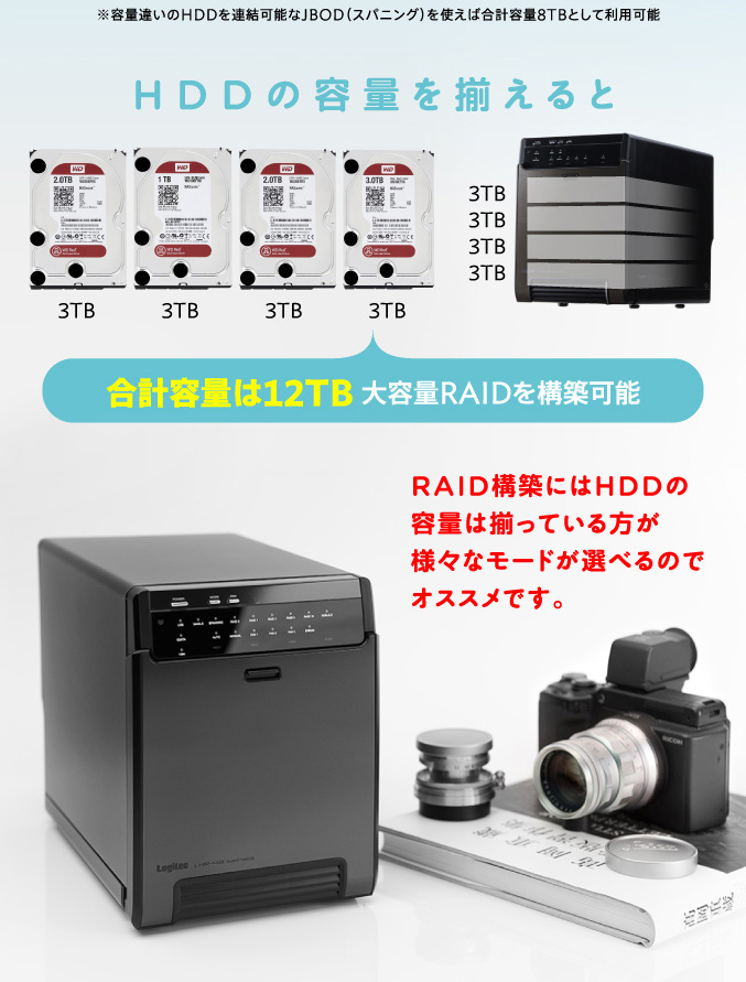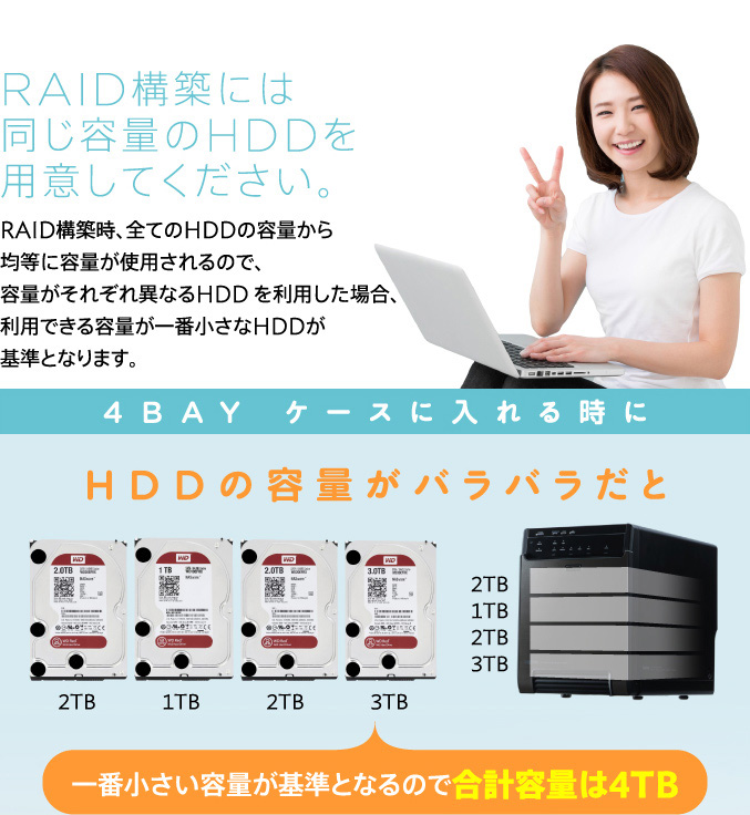 なお、RAID構築は一番少ない容量のハードディスクが