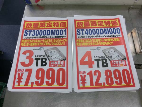 「ST3000DM001」を20本限定7990円、4Tバイトモデル「ST4000DM000」を10本限定1万2890円で販売している。