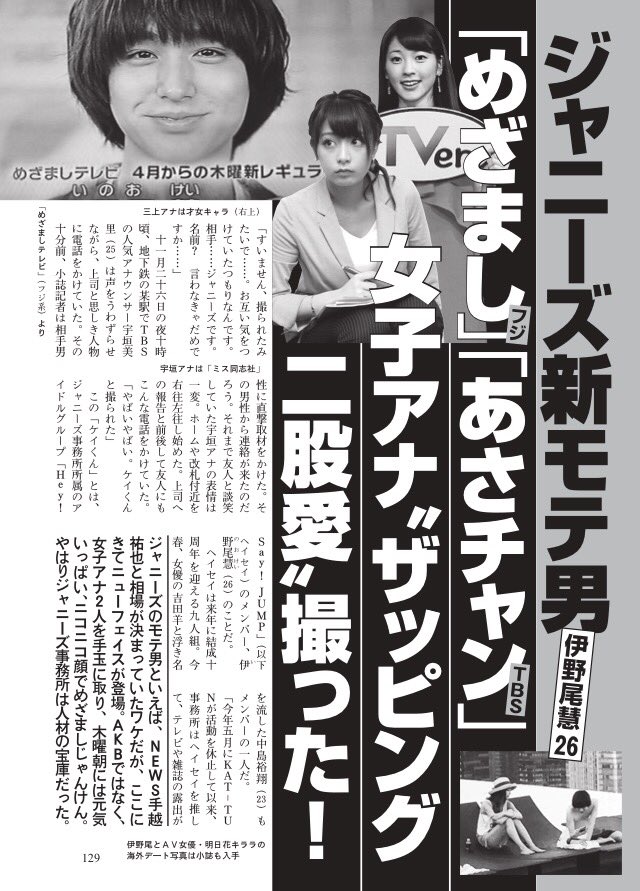 ある。「週刊文春」では2人の女子アナが伊野尾の自宅マンションを訪れる姿などを