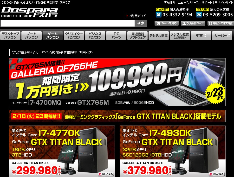 【ドスパラ】GTX765M搭載 GALLERIA QF765HE 期間限定1万円引き!